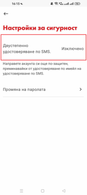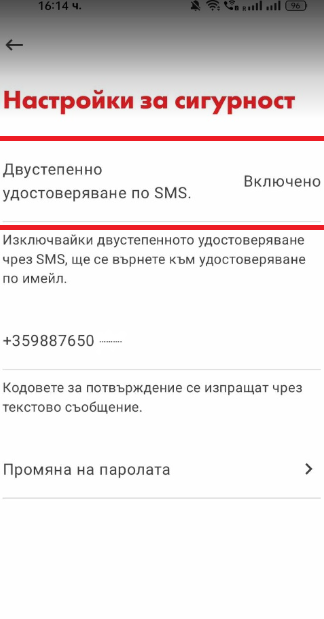 5. Ще видите този екран, което означава, че двустепенното удостоверяване по SMS е активирано. В секция "Настройки" също се вижда, че фунцкията е вкючена.