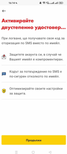 Тази допълнителна стъпка ще даде по-добра защита на профила Ви, в случай че имейлът, с който сте регистрирани, е компроментиран.